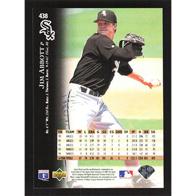 This is a 1995 Upper Deck Jim Abbott baseball card. The card is #438 and pictures show condition.