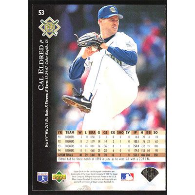 This is a 1995 Upper Deck Cal Eldred baseball card. The card is #53 and pictures show condition.