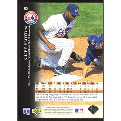 This is a 1995 Upper Deck Cliff Floyd baseball card. The card is #80 and pictures show condition.
