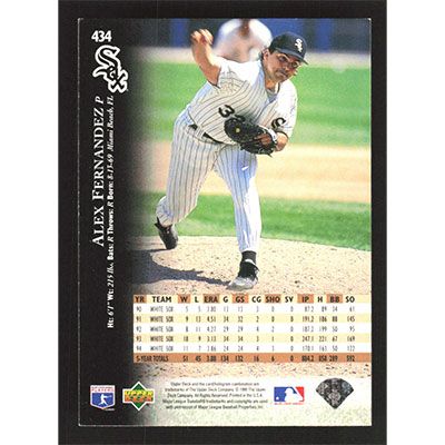 This is a 1995 Upper Deck Electric Diamond Alex Fernandez baseball card. The card is #434 and pictures show condition.