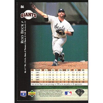 This is a 1995 Upper Deck Electric Diamond Rod Beck baseball card. The card is #86 and pictures show condition.