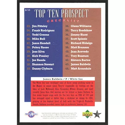 This is a 1995 Upper Deck Minors Top 10 Prospects James Baldwin baseball card. The card is #2 and pictures show condition.