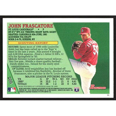 This is a 1996 Bowman John Frascatore baseball card. The card is #206 and pictures show condition.
