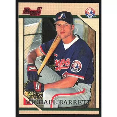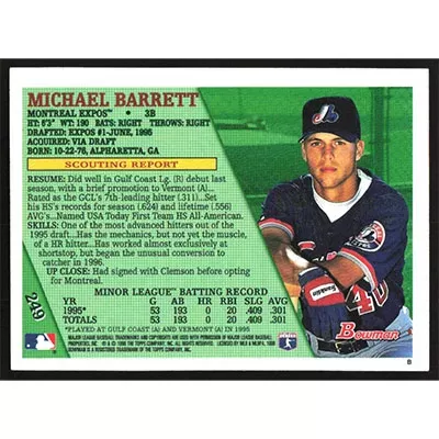This is a 1996 Bowman Michael Barrett baseball card. The card is #249 and pictures show condition.