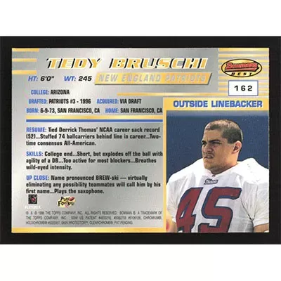 This is a 1996 Bowman's Best Tedy Bruschi football card. The card is #162 and pictures show condition.