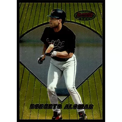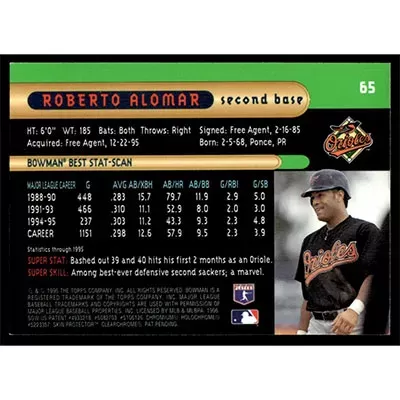 This is a 1996 Bowman's Best Roberto Alomar baseball card. The card is #65 and pictures show condition.