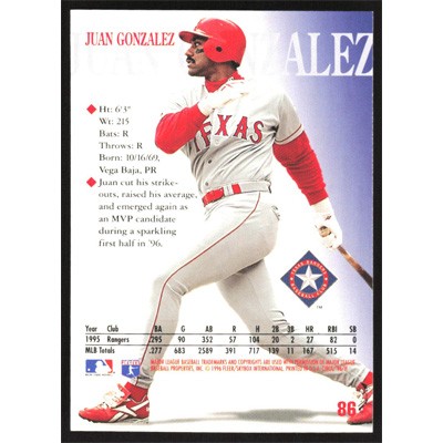 This is a 1996 Circa Juan Gonzalez baseball card. The card is #86 and pictures show condition.