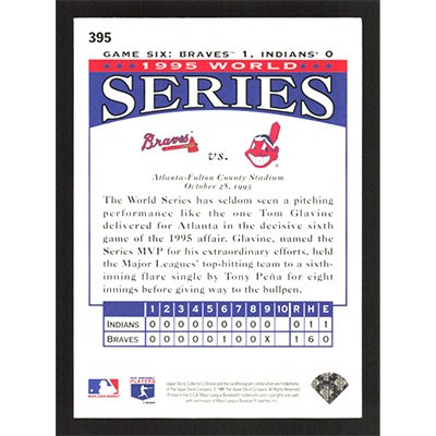 This is a 1996 Collector's Choice Tom Glavine World Series baseball card. The card is #395 and pictures show condition.