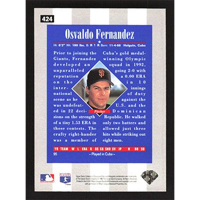 This is a 1996 Collector's Choice Osvaldo Fernandez Rookie Class baseball card. The card is #424 and pictures show condition. Team(s): San Francisco Giants Rookie Card (RC)