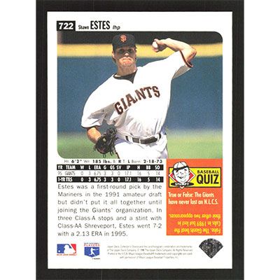This is a 1996 Collector's Choice Shawn Estes baseball card. The card is #722 and pictures show condition.