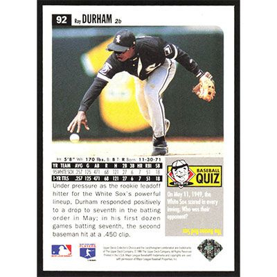 This is a 1996 Collector's Choice Ray Durham All Rookie baseball card. The card is #92 and pictures show condition.