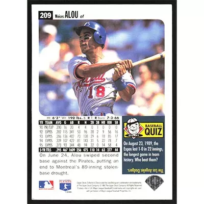 This is a 1996 Collector's Choice Silver Signature Moises Alou baseball card. The card is #209 and pictures show condition.