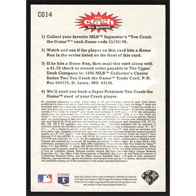 This is a 1996 Collector's Choice You Crash the Game Dante Bichette baseball card. The card is #CG14 and pictures show condition. Team(s): Colorado Rockies