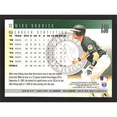 This is a 1996 Donruss Mike Bordick baseball card. The card is #130 and pictures show condition.