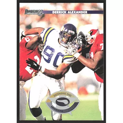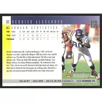 This is a 1996 Donruss Derrick Alexander football card. The card is #150 and pictures show condition.