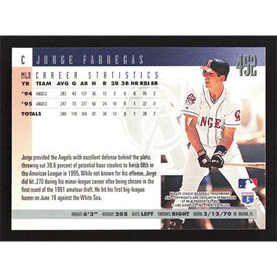This is a 1996 Donruss Jorge Fabregas baseball card. The card is #452 and pictures show condition.