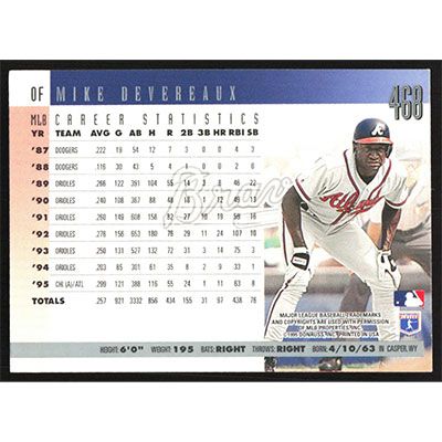 This is a 1996 Donruss Mike Devereaux autographed baseball card. This card has been signed, in blue, by Mike Devereaux, and is guaranteed authentic by Ballcardz.com. The card is #468 and pictures show condition.