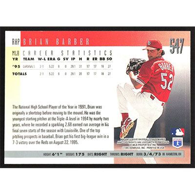This is a 1996 Donruss Brian Barber baseball card. The card is #547 and pictures show condition.