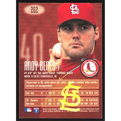 This is a 1996 E-Motion XL Andy Benes baseball card. The card is #262 and pictures show condition.