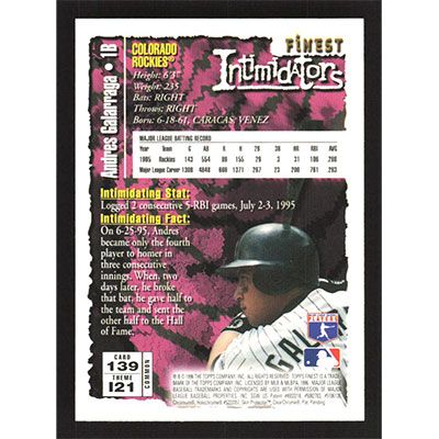 This is a 1996 Finest Andres Galarraga baseball card. The card is #139 and pictures show condition.