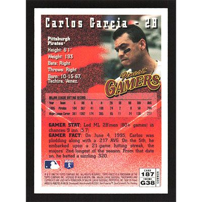 This is a 1996 Finest Carlos Garcia baseball card. The card is #187 and pictures show condition.