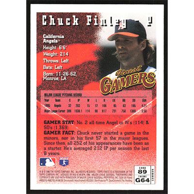 This is a 1996 Finest Chuck Finley Gamers baseball card. The card is #89 and pictures show condition.