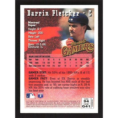 This is a 1996 Finest Darrin Fletcher Gamers baseball card. The card is #94 and pictures show condition.