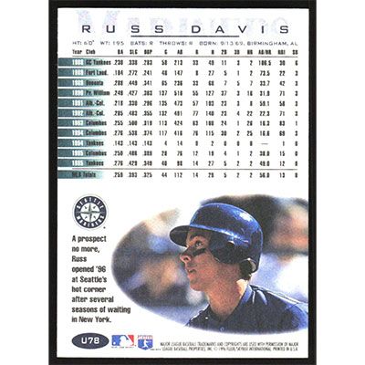 This is a 1996 Fleer Update Russ Davis baseball card. The card is #U78 and pictures show condition.