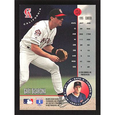 This is a 1996 Leaf Gary DiSarcina baseball card. The card is #134 and pictures show condition.