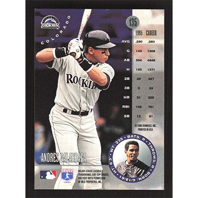 This is a 1996 Leaf Andres Galarraga baseball card. The card is #135 and pictures show condition.