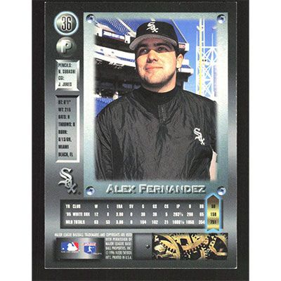 This is a 1996 Metal Universe Alex Fernandez baseball card. The card is #36 and pictures show condition.