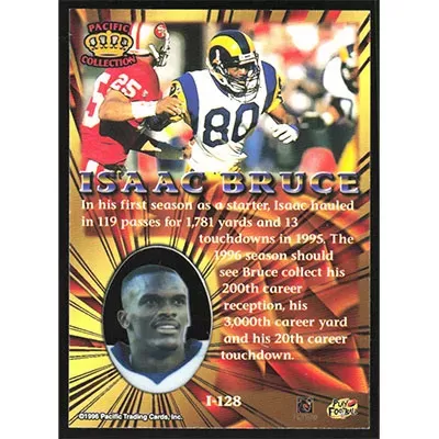 This is a 1996 Pacific Invincible Bronze Isaac Bruce football card. The card is #I-128 and pictures show condition.