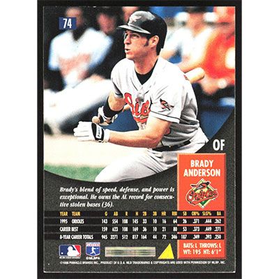 This is a 1996 Pinnacle Brady Anderson baseball card. The card is #74 and pictures show condition.