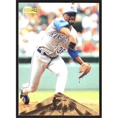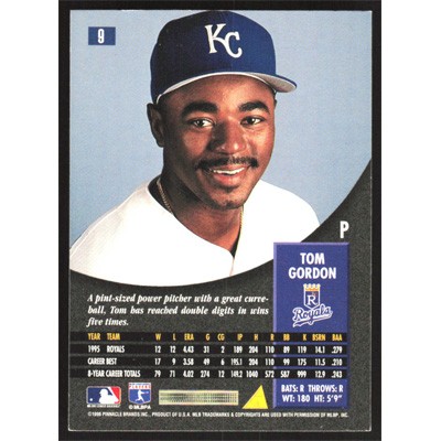 This is a 1996 Pinnacle Tom Gordon baseball card. The card is #9 and pictures show condition.