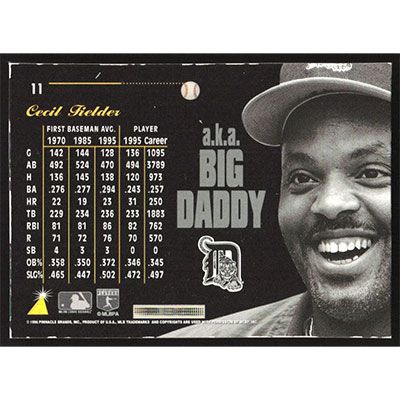 This is a 1996 Pinnacle Aficionado Cecil Fielder baseball card. The card is #11 and pictures show condition.