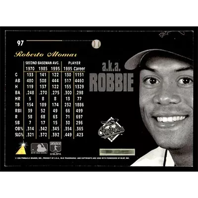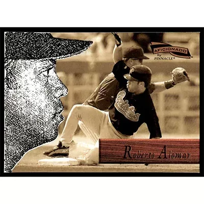 This is a 1996 Pinnacle Aficionado Roberto Alomar baseball card. The card is #97 and pictures show condition.