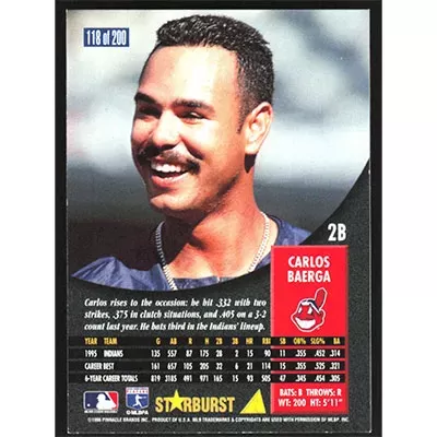 This is a 1996 Pinnacle Starburst Carlos Baerga baseball card. The card is #118 and pictures show condition.
