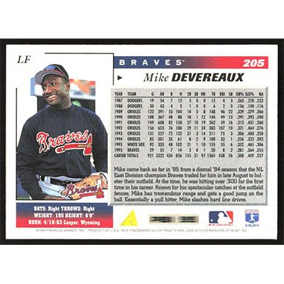 This is a 1996 Score Mike Devereaux baseball card. The card is #205 and pictures show condition.
