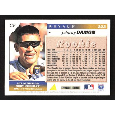 This is a 1996 Score Johnny Damon baseball card. The card is #223 and pictures show condition.