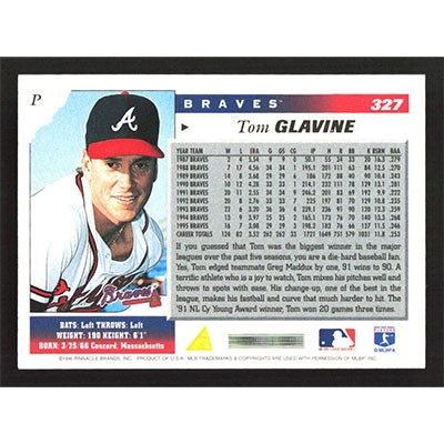 This is a 1996 Score Tom Glavine baseball card. The card is #327 and pictures show condition.