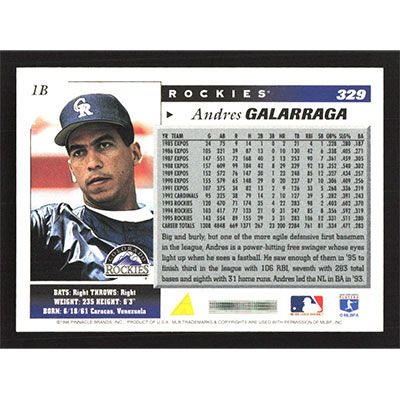 This is a 1996 Score Andres Galarraga baseball card. The card is #329 and pictures show condition.