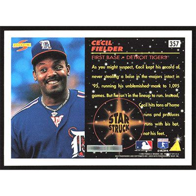 This is a 1996 Score Cecil Fielder Star Struck baseball card. The card is #357 and pictures show condition.
