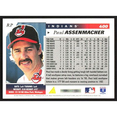 This is a 1996 Score Paul Assenmacher baseball card. The card is #400 and pictures show condition.