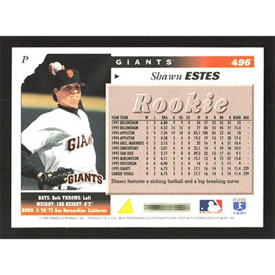 This is a 1996 Score Shawn Estes baseball card. The card is #496 and pictures show condition.
