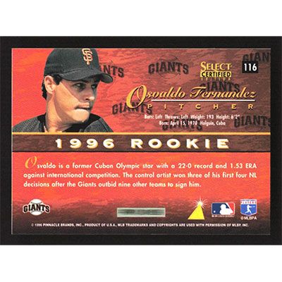 This is a 1996 Select Certified Osvaldo Fernandez baseball card. The card is #116 and pictures show condition. Team(s): San Francisco Giants Rookie Card (RC)