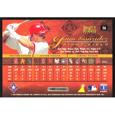 This is a 1996 Select Certified Juan Gonzalez baseball card. The card is #56 and pictures show condition.