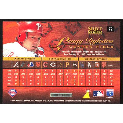 This is a 1996 Select Certified Lenny Dykstra baseball card. The card is #72 and pictures show condition.