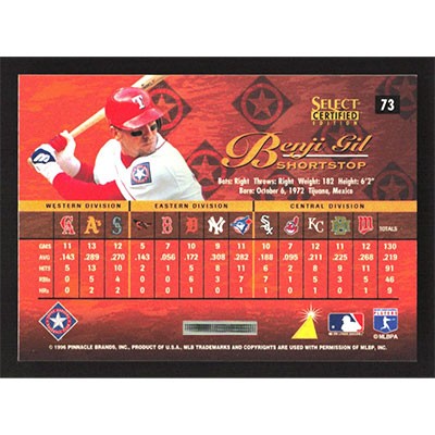 This is a 1996 Select Certified Benji Gil baseball card. The card is #73 and pictures show condition.