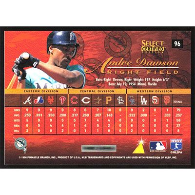 This is a 1996 Select Certified Andre Dawson baseball card. The card is #96 and pictures show condition.