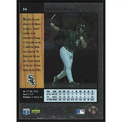 This is a 1996 SP Harold Baines baseball card. The card is #56 and pictures show condition.